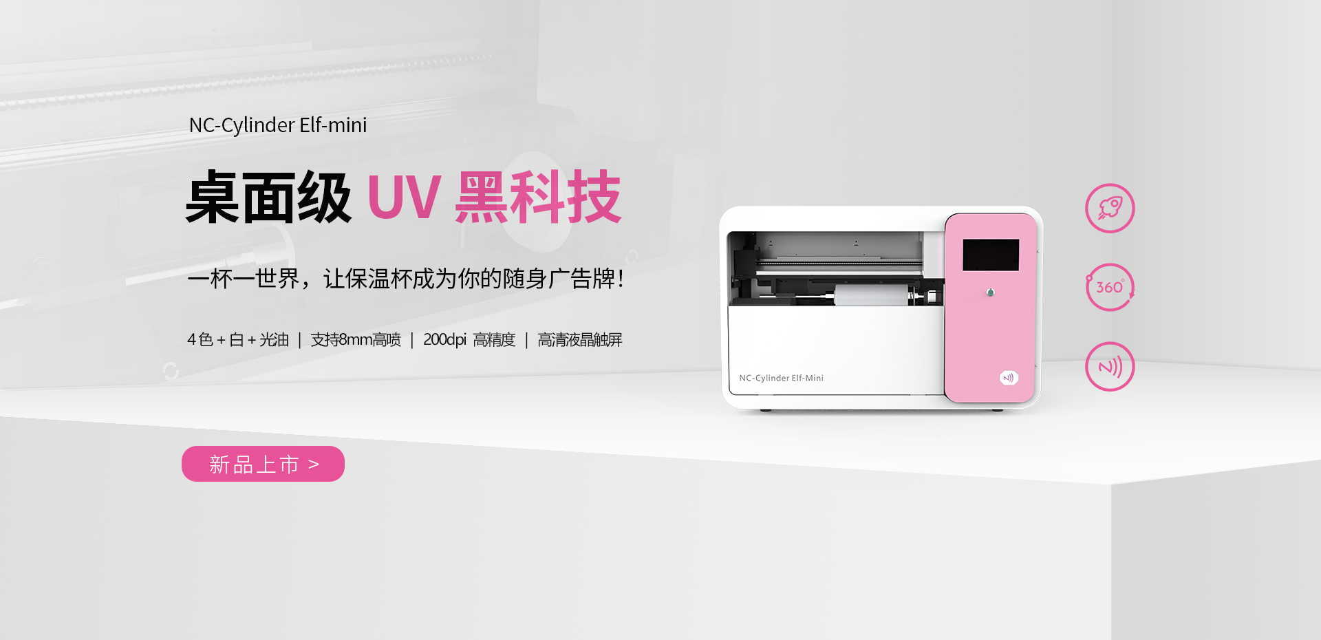 可加裝電動圓柱體治具,實現360度旋轉打印,馬克杯,保溫杯等柱形產品均可打印,滿足多樣化的定制需求。
